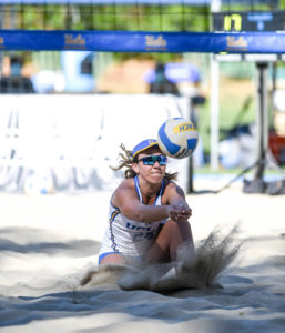 Photo: Graduate student Savvy Simo and No. 4 UCLA beach volleyball have the chance to win a third consecutive national championship this season, and the Bruins were able to take down two top-three teams in the country this weekend at Mapes Beach. (Christine Kao/Daily Bruin staff)