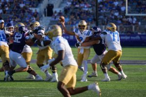 Photo: Redshirt sophomore quarterback Nico Iamaleava throws the ball as he is pressured by the Northwestern defense. Iamaleava finished the game with 180 yards through the air and 65 on the ground. (Michael Gallagher/Assistant Photo editor)
