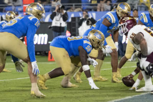 Photo: UCLA football head coach DeShaun Foster stands in front of the team as they wait to run onto the field at the Rose Bowl. (Aidan Sun/Assistant Photo editor)