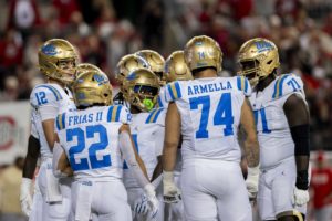 Photo: Redshirt sophomore quarterback Luke Duncan prepares to throw the ball. Duncan entered the game after redshirt sophomore quarterback Nico Iamaleava went down with an injury, finishing 5-11 for 81 passing yards and throwing for the Bruins’ sole touchdown of the match. (Michael Gallagher/Assistant Photo editor)