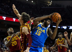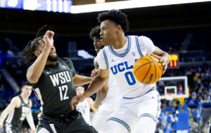 Photo: Sophomore guard Jaylen Clark drives to the paint against Washington State on Feb. 17. Clark and No. 12 UCLA men’s basketball will start a three-game road trip against Oregon on Thursday. (Esther Li/Daily Bruin staff)