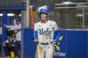 Photo: Sophomore outfielder Rylee Slimp glances at her bat before stepping into the batter’s box. Slimp has recorded 20 hits, including seven extra-base hits, across 46 at-bats this season. (Kai Dizon/Daily Bruin senior staff)