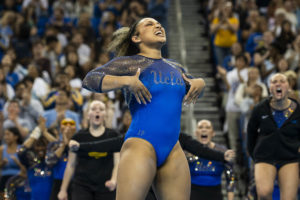 Photo: Junior Sydney Barros celebrates and displays the UCLA logo on her chest. (Zimo Li/Daily Bruin senior staff)