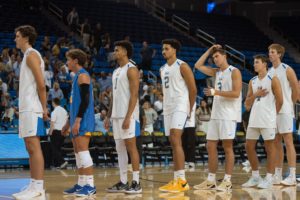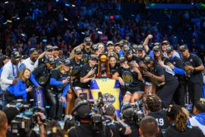 Photo: Senior Ciena Alipio (right) hugs assistant coach Lacy Dagen (left) after her beam routine. (Andrew Ramiro Diaz/Photo editor)