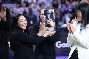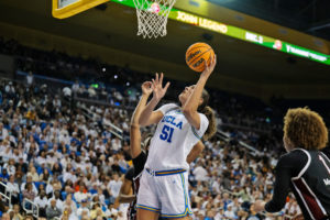 Photo: Senior center Lauren Betts raises the ball to attempt a shot at the rim. Betts posted a game-high 21 points. (Aidan Sun/Assistant Photo editor)