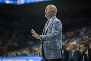 Photo: Senior guard Skyy Clark holds the ball in his hands at Pauley Pavilion. (Aidan Sun/Assistant Photo editor)