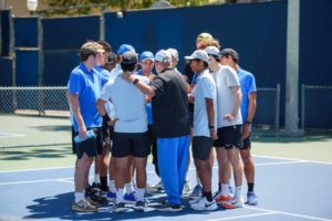 Photo: Members of UCLA men’s tennis huddle together. (Ruby Galbraith/Daily Bruin staff)