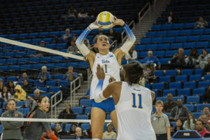 Photo: Members of UCLA women’s volleyball stand in a circle talking. (Vanessa Man/Daily Bruin)