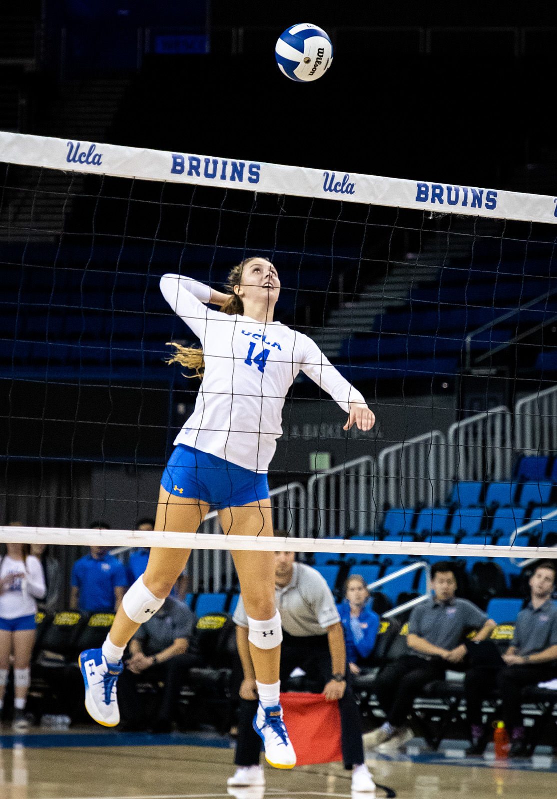 Photo: Sophomore outside hitter Jenny Mosser led the Bruins with 11 kills in their most recent match against Arizona last weekend. Mosser is second for UCLA women’s volleyball on the season with 232 total kills and 2.49 kills per set. (Joe Akira/Daily Bruin staff)
