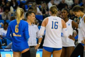 Photo: Members of UCLA women’s volleyball gather together in a circle on the court. (Daily Bruin file photo)